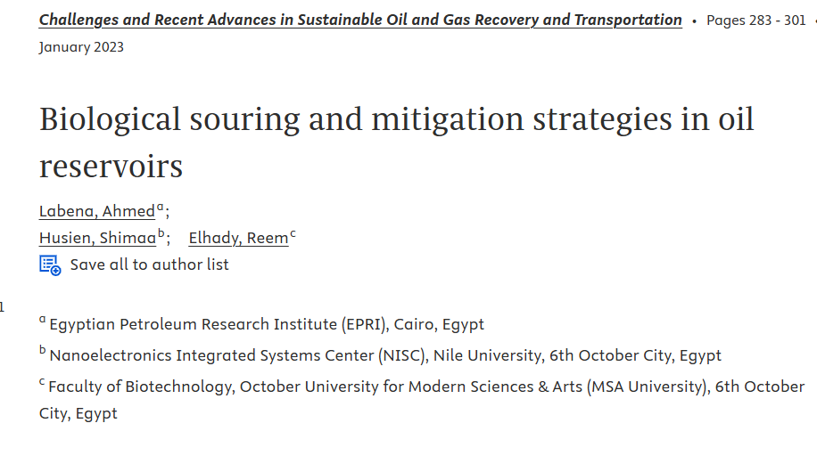 Biological souring is one of the major problems facing the oil and gas sector as a result of biogenic sulfide generation in the reservoirs. Sulfidogenic microorganism and particularly sulfate-reducing bacteria are the main generator of the biogenic sulfide. In consequence, souring has a plethora of economic and environmental problems. It has a negative impact on the petroleum industry, where the generated sulfide lowers air quality and causes adverse health problems due to its toxicity and carcinogenicity. Furthermore, it affects the whole industry by reducing the product quality and enhancing metal corrosion. Therefore, different physical, chemical, and biological mitigation strategies have been developed for biological souring inhibition. In this chapter, the biological souring definition, mechanism, factors affecting the souring process, and the mitigation strategies and the methods used to assay the souring will be discussed. © 2023 Elsevier Inc. All rights reserved.
