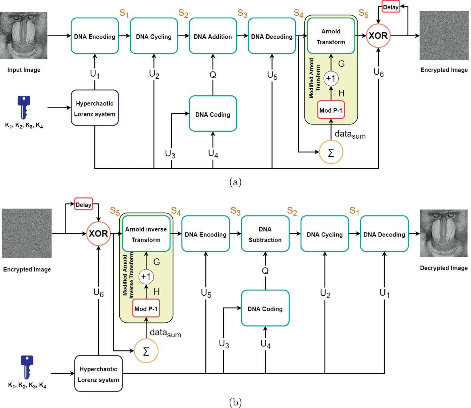 Digital images, which we store and communicate everyday, may contain confidential information that must not be exposed to others. Numerous researches are interested in encryption, which protects the images from ending up in the hands of unauthorized third parties. This paper proposes an image encryption scheme using chaotic systems, DNA manipulation, and a modified Arnold transform. Both DNA manipulation and hyperchaotic Lorenz system are utilized in the substitution of the images’ pixel values. An additional role of hyperchaotic Lorenz system is that it generates the random numbers required within the DNA manipulation steps. DNA cycling is implemented based on simple DNA coding rules and DNA addition and subtraction rules with modulus operation. The modified Arnold transform alters the pixels’ positions, where it guarantees effective pixel permutation that never outputs the same input pixels arrangement again. The proposed design is simple and amenable for hardware realization. Several well established performance evaluation tests including statistical properties of the encrypted image, key space, and differential attack analysis were conducted for several images. The proposed scheme passed the tests and demonstrated good results compared to several recent chaos-based image encryption schemes. © 2023, The Author(s), under exclusive license to Springer Nature Switzerland AG.