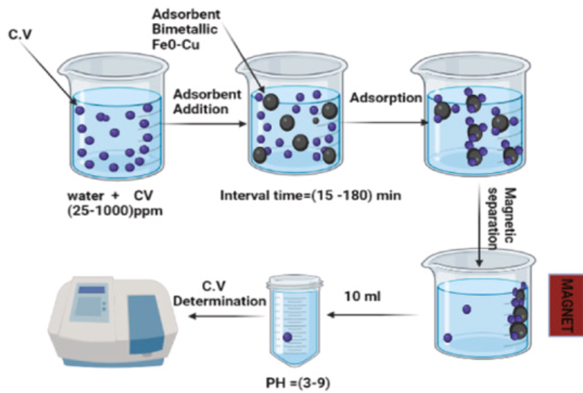 Nano zero-valent iron (nZVI), bimetallic nano zero-valent iron-copper (Fe0– Cu), and fava bean activated carbon-supported bimetallic nano zero-valent iron-copper (AC-Fe0-Cu) are synthesized and characterized using DLS, zeta potential, FT-IR, XRD, and SEM. The maximum removal capacity is demonstrated by bimetallic Fe0–Cu, which is estimated at 413.98 mg/g capacity at pH 7, 180 min of contact duration, 120 rpm shaking speed, ambient temperature, 100 ppm of C.V. dye solution, and 1 g/l dosage. The elimination capability of the H2SO4 chemical AC-Fe0-Cu adsorbent is 415.32 mg/g under the same conditions but with a 150 ppm C.V. dye solution. The H3PO4 chemical AC-Fe0-Cu adsorbent achieves a removal capacity of 413.98 mg/g under the same conditions with a 350 ppm C.V. dye solution and a 1.5 g/l dosage. Optimal conditions for maximum removal efficiency are determined by varying pH (3–9), time intervals (15–180 min), and initial dye concentrations (25–1000 ppm). Kinetic and isothermal models are used to fit the results of time and concentration experiments. The intra-particle model yields the best fit for bimetallic Fe0–Cu, H2SO4 chemical AC- Fe0–Cu, and H3PO4 chemical AC-Fe0-Cu, with corrected R-Squared values of 0.9656, 0.9926, and 0.964, respectively. The isothermal results emphasize the significance of physisorption and chemisorption in concentration outcomes. Response surface methodology (RSM) and artificial neural networks (ANN) are employed to optimize the removal efficiency. RSM models the efficiency and facilitates numerical optimization, while the ANN model is optimized using the moth search algorithm (MSA) for optimal results. © 2023