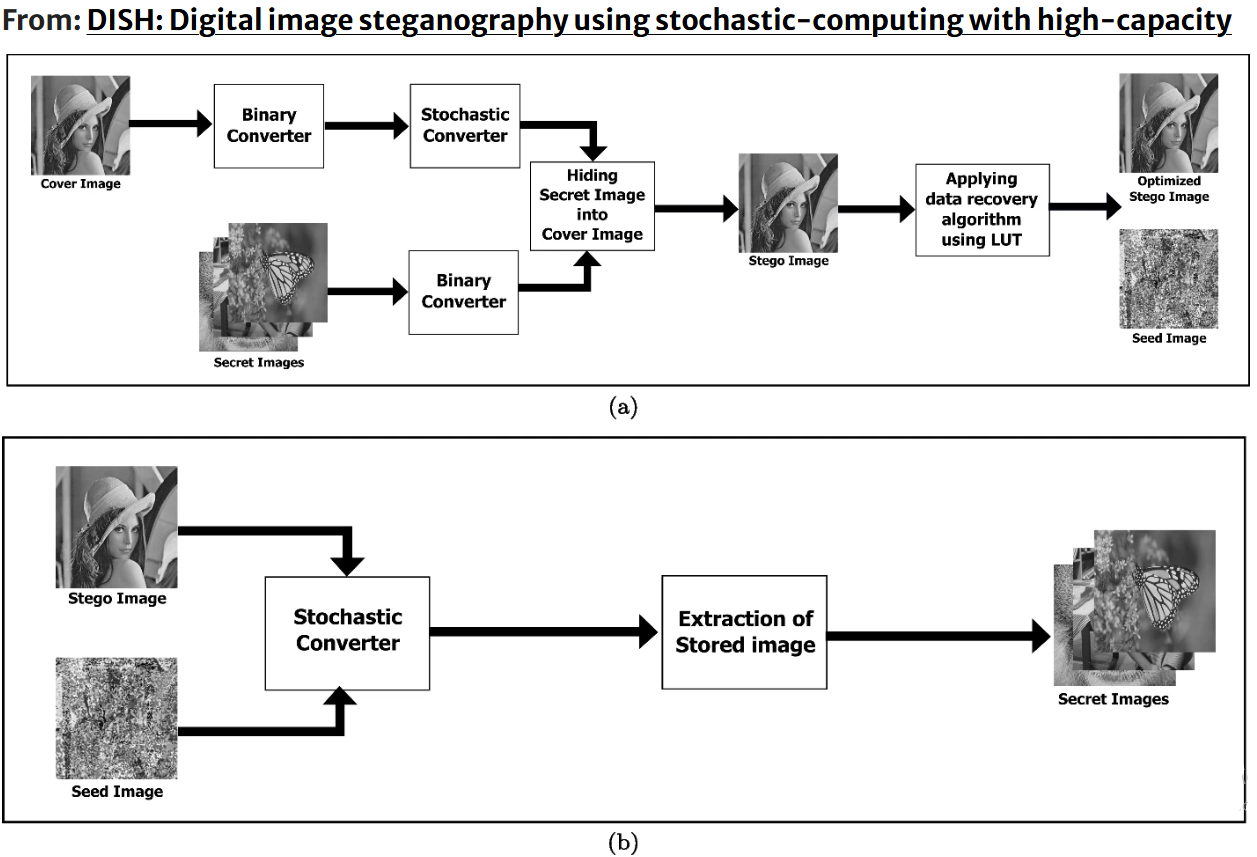 Stochastic computing is a relatively new approach to computing that has gained interest in recent years due to its potential for low-power and high-noise environments. It is a method of computing that uses probability to represent and manipulate data, therefore it has applications in areas such as signal processing, machine learning, and cryptography. Stochastic steganography involves hiding a message within a cover image using a statistical model. Unlike traditional steganography techniques that use deterministic algorithms to embed the message, stochastic steganography uses a probabilistic approach to hide the message in a way that makes it difficult for an adversary to detect. Due to this error robustness and large bit streams stochastic computing, they are well suited for high capacity and secure image steganography. In this paper, as per the authors’ best knowledge, image steganography using stochastic computing based on linear feedback shift register (LFSR) is proposed for the first time. In the proposed technique, the cover image is converted to stochastic representation instead of the binary one, and then a secret image is embedded in it. The resulting stego image has a high PSNR value transmitted with no visual trace of the hidden image. The final results are stego image with PSNR starting from 30 dB and a maximum payload up to 40 bits per pixel (bpp) with an effective payload up to 28 bpp. The proposed method achieves high security and high capability of the number of stored bits in each pixel. Thus, the proposed method can prove a vital solution for high capacity and secure image steganography, which can then be extended to other types of steganography. © 2024, The Author(s).