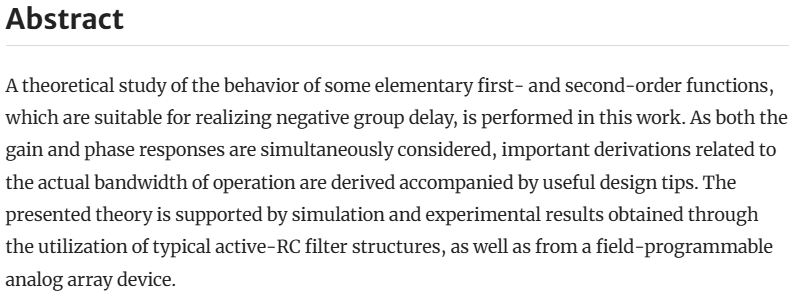 A theoretical study of the behavior of some elementary first- and second-order functions, which are suitable for realizing negative group delay, is performed in this work. As both the gain and phase responses are simultaneously considered, important derivations related to the actual bandwidth of operation are derived accompanied by useful design tips. The presented theory is supported by simulation and experimental results obtained through the utilization of typical active-RC filter structures, as well as from a field-programmable analog array device. © The Author(s) 2024.