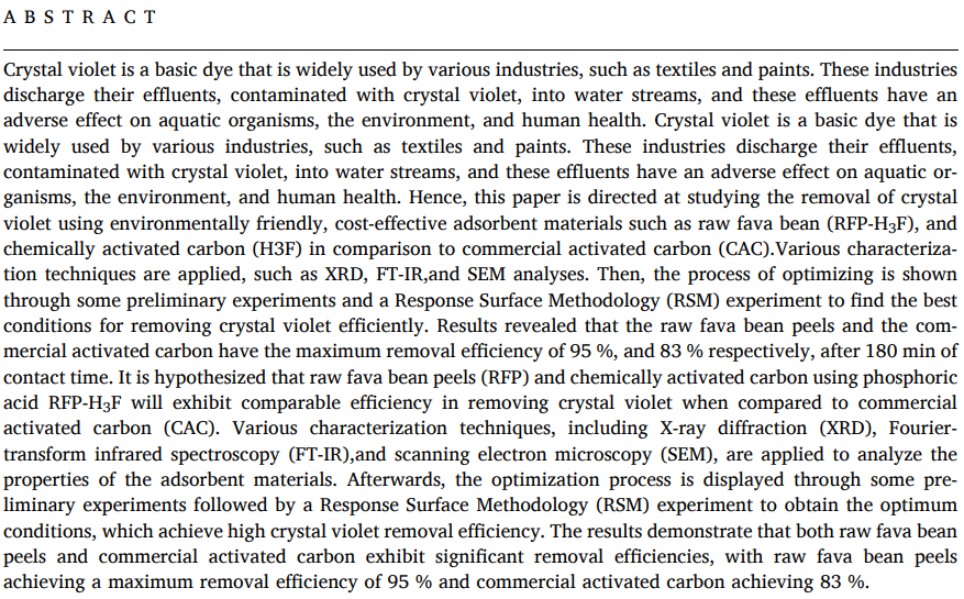 Crystal violet is a basic dye that is widely used by various industries, such as textiles and paints. These industries discharge their effluents, contaminated with crystal violet, into water streams, and these effluents have an adverse effect on aquatic organisms, the environment, and human health. Crystal violet is a basic dye that is widely used by various industries, such as textiles and paints. These industries discharge their effluents, contaminated with crystal violet, into water streams, and these effluents have an adverse effect on aquatic organisms, the environment, and human health. Hence, this paper is directed at studying the removal of crystal violet using environmentally friendly, cost-effective adsorbent materials such as raw fava bean (RFP-H3F), and chemically activated carbon (H3F) in comparison to commercial activated carbon (CAC).Various characterization techniques are applied, such as XRD, FT-IR,and SEM analyses. Then, the process of optimizing is shown through some preliminary experiments and a Response Surface Methodology (RSM) experiment to find the best conditions for removing crystal violet efficiently. Results revealed that the raw fava bean peels and the commercial activated carbon have the maximum removal efficiency of 95 %, and 83 % respectively, after 180 min of contact time. It is hypothesized that raw fava bean peels (RFP) and chemically activated carbon using phosphoric acid RFP-H3F will exhibit comparable efficiency in removing crystal violet when compared to commercial activated carbon (CAC). Various characterization techniques, including X-ray diffraction (XRD), Fourier-transform infrared spectroscopy (FT-IR),and scanning electron microscopy (SEM), are applied to analyze the properties of the adsorbent materials. Afterwards, the optimization process is displayed through some preliminary experiments followed by a Response Surface Methodology (RSM) experiment to obtain the optimum conditions, which achieve high crystal violet removal efficiency. The results demonstrate that both raw fava bean peels and commercial activated carbon exhibit significant removal efficiencies, with raw fava bean peels achieving a maximum removal efficiency of 95 % and commercial activated carbon achieving 83 %. © 2023 The Authors