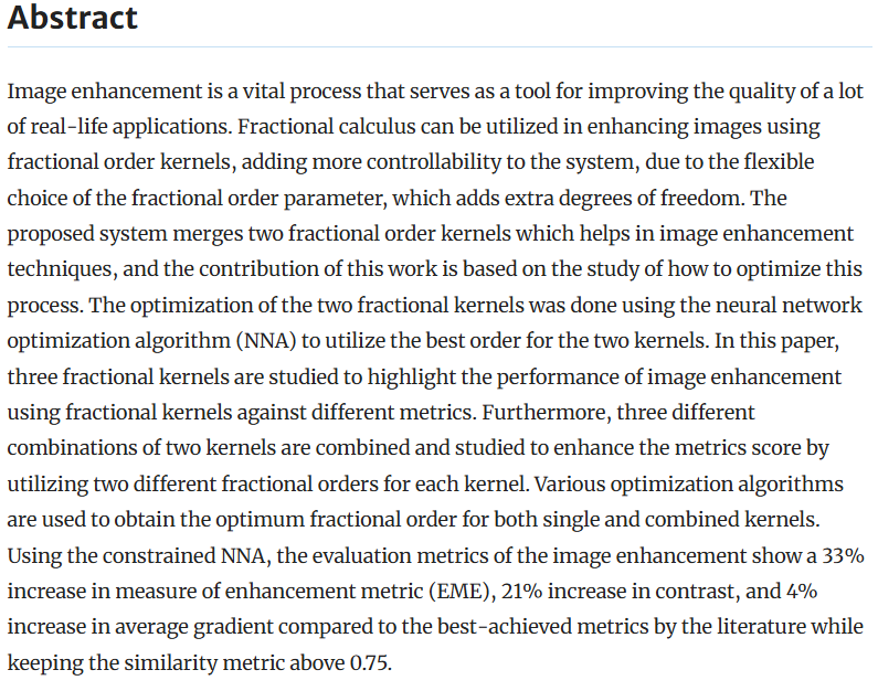 Image enhancement is a vital process that serves as a tool for improving the quality of a lot of real-life applications. Fractional calculus can be utilized in enhancing images using fractional order kernels, adding more controllability to the system, due to the flexible choice of the fractional order parameter, which adds extra degrees of freedom. The proposed system merges two fractional order kernels which helps in image enhancement techniques, and the contribution of this work is based on the study of how to optimize this process. The optimization of the two fractional kernels was done using the neural network optimization algorithm (NNA) to utilize the best order for the two kernels. In this paper, three fractional kernels are studied to highlight the performance of image enhancement using fractional kernels against different metrics. Furthermore, three different combinations of two kernels are combined and studied to enhance the metrics score by utilizing two different fractional orders for each kernel. Various optimization algorithms are used to obtain the optimum fractional order for both single and combined kernels. Using the constrained NNA, the evaluation metrics of the image enhancement show a 33% increase in measure of enhancement metric (EME), 21% increase in contrast, and 4% increase in average gradient compared to the best-achieved metrics by the literature while keeping the similarity metric above 0.75. © The Author(s), under exclusive licence to Springer Science+Business Media, LLC, part of Springer Nature 2024.