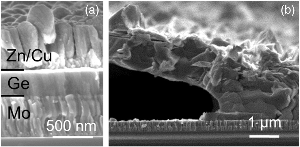 Cu2ZnGeSe4(CZGeSe) can be considered as a potential alternative for wide band gap thin film devices. In this work, CZGeSe thin films were deposited on Mo-coated soda lime glass substrates by sequential deposition of sputtered Cu, Zn and e-beam evaporated Ge layers from elemental targets followed by annealing at high temperature using H2Se gas. We report on the effect of the precursor stack order and composition and the impact of the annealing temperature on the physical properties of CZGeSe thin films. The optimal layer morphology was obtained when using a Mo/Cu/Zn/Ge precursor stack annealed at 460 °C. We have observed that the formation of secondary phases such as ZnSe can be prevented by tuning the initial composition of the stack, the stack order and the annealing conditions. This synthesis process allows synthesizing CZGeSe absorber with an optical band gap of 1.5 eV. © 2014 Elsevier B.V.