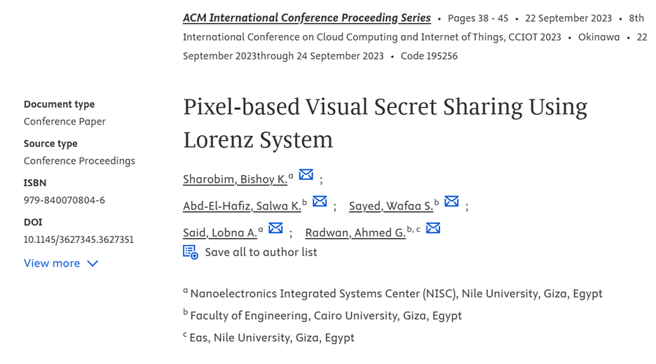 (n, n)-Visual Secret Sharing (VSS) allows a user to send an image in the form of shares to different participants. Every share can not reveal the secret alone, and only all shares together can reveal the secret with fast recovery. This paper proposes a pixel-based (n, n)-VSS system, where to share a pixel from the secret image, (n - 1) random pixels are generated from the Lorenz chaotic system for a varying set of (n - 1) shares. Then, the nth pixel is calculated for a random share using the secret pixel and the generated (n - 1) random pixels. The system is efficient, lossless, implemented for grayscale and color images, and has a simple XOR-based recovery scheme. It passed several security analysis tests and is robust against noise attacks. Moreover, performance analysis and comparisons with other VSS systems are presented, showing good results. © 2023 ACM.