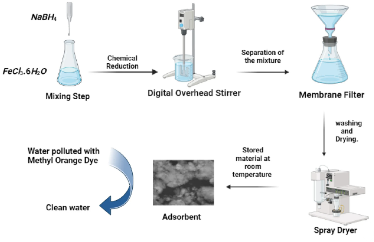 Nano zero-valent iron (nZVI), bimetallic Nano zero-valent iron-copper (Fe 0- Cu), and fava bean activated carbon-supported with bimetallic Nano zero-valent iron-copper (AC-F e 0-Cu) were prepared and characterized by DLS, FT-IR, XRD, and SEM. The influence of the synthesized adsorbents on the adsorption and removal of soluble anionic methyl orange (M.O) dye was investigated using UV-V spectroscopy. The influence of numerous operational parameters was studied at varied pH (3–9), time intervals (15–180 min), and dye concentrations (25–1000 ppm) to establish the best removal conditions. The maximum removal efficiency of M.O. using the prepared adsorbent materials reached about 99%. The removal efficiency is modeled using response surface methodology (RSM). The Bimetallic Fe -Cu, the best experimental and predicted removal efficiency is 96.8% RE. For the H2SO4 chemical AC- Fe -Cu, the best experimental and removal efficiency is 96.25% RE. The commercial AC-Fe0–Cu, the best experimental and predicted removal efficiency is 94.93%RE. This study aims to produce low-cost adsorbents such as Bimetallic Fe0-Cu, and Fava Bean Activated Carbon-Supported Bimetallic AC-Fe0-Cu to treat the industrial wastewater from the anionic methyl orange (M.O) dye and illustrate its ability to compete H2SO4 chemical AC-Fe0-Cu, and commercial AC-Fe0-Cu. © 2023, The Author(s).
