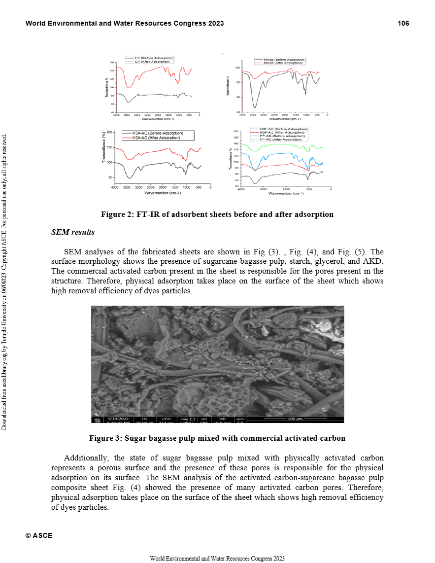 Industrial wastewater often contains considerable amounts of toxic pollutants that would endanger public health and the environment. In developing countries, these toxins are often discharged into natural ecosystems without pretreatment as it requires costly treatment processes, which causes long-term harmful socioeconomic impacts. Employing wastewater treatment plants using physical, biological, and chemical methods to clean the wastewater is considered by many nations the answer to the environmental crises. The treated water could be used for targeting the irrigation systems in its majority, as it is biologically acceptable for that specific use, which economizes the use of freshwater sources for municipal use specifically. This study presents a novel method for fabricating an efficient adsorbent sheet for wastewater treatment. The sheets are fabricated by combining sugarcane bagasse pulp as a scaffold with commercial, naturally activated carbon and bimetallic-prepared adsorbents. Fava beans and algae biomass are utilized in the production of activated carbon because of their high carbon contents, availability, and low cost. The prepared composite sheets are synthesized and investigated for several pollutants' removal such as methyl orange, crystal violet dyes, and chromium heavy metals. These pollutants are selected due to the high discharge amount and toxic effect on aquatic life. FT-IR and SEM analyses are used to characterize the samples. To determine the mechanism of adsorption, the intra-particle diffuse, pseudo-first-order, and pseudo-second-order kinetic models are used to test the experimental data. All the prepared sheets can retain the pollutants, with the best removal efficiency of 96.24% for methyl orange adsorption onto the bio-composite mixed sheet. For methyl orange, the error values and correlation coefficient R2of 0.971 and 0.951 shows that the Temkin isotherm and pseudo-first-order kinetic model, respectively, are capable of providing the highest goodness of fit for the experimental data. The results of the isotherms and kinetics parameter sets provided valuable proof that the adsorption of methyl orange onto the bio-composite sheet is an endothermic phenomenon involving both chemical and physical adsorption. © World Environmental and Water Resources Congress 2023.All rights reserved