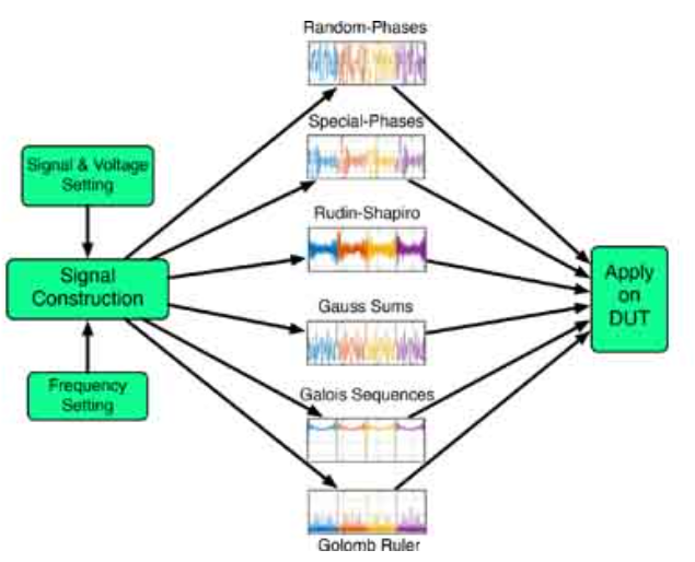In this work, we generate and use a total of six different wideband signals for joint time-frequency characterization of nonlinear time-invariant [N-shaped differential resistor (NDR)] and linear time-varying (thermistor) circuits. A data acquisition board is used for applying the signals in the form of a voltage excitation and reading the induced current. The input signals have flat power spectra, thus avoiding the need for iterative calibration loops required to obtain signals with low crest factor. Such iterative loops are unavoidable when using random, pseudorandom, or chaotic signals all of which have a wideband spectrum but not necessarily a flat one. Flat spectra help in controlling the maximum voltage within the generated signal, thus eliminating large spikes in the obtained signal. The accuracy of the measurements is compared with the measurements acquired on a Biologic VSP-300 electrochemical station. An average relative error margin of 3% at most is obtained. © 2001-2012 IEEE.